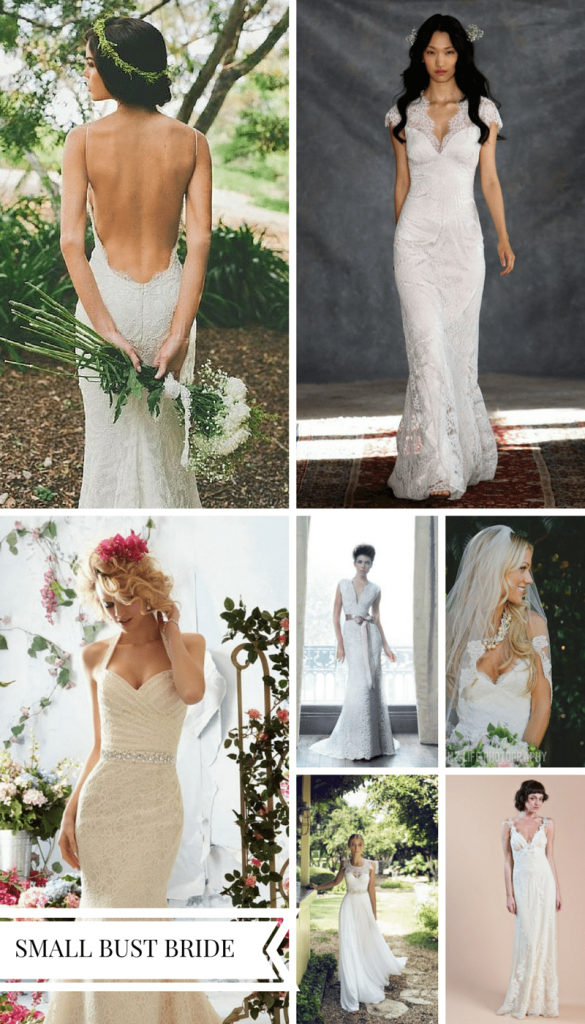 …try an Empire dress with a skirt that begins just under the bust. Ensure the seam does not begin on the chest and the fabric doesn’t feature pleating, as these features are for maternity dresses! A loose dress will add weight, so look for an option that plays up the shape. In terms of fabric, go for options that offer structure, such as satin. Stay away from “flowy” fabrics as well. If a fan of this look, opt for a gown with a stiffer base, then add a tulle overlay.