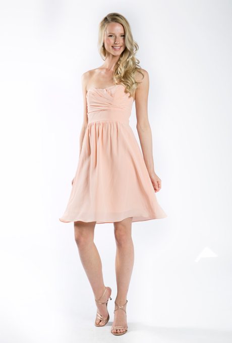 Peach Bridesmaids DressesShort and simple, this design is easily dressed up or around the theme using accessories.