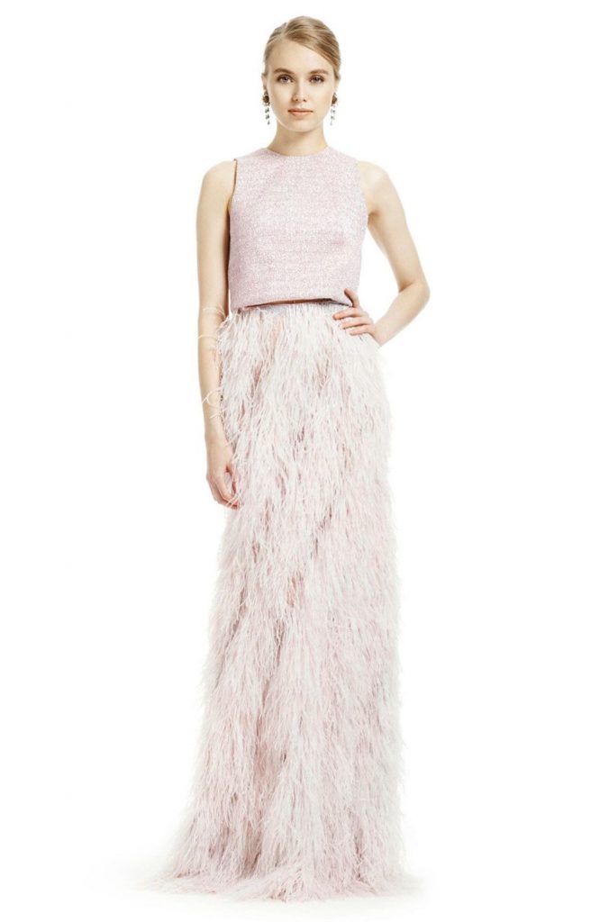 I’m loving this two-piece beauty. This feathered skirt has a formal feel but can also be a daytime look as well.