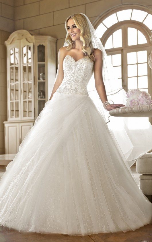 If you want to show off your shape but still have that ball gown style, you’ll want a drop-waisted gown like this!
