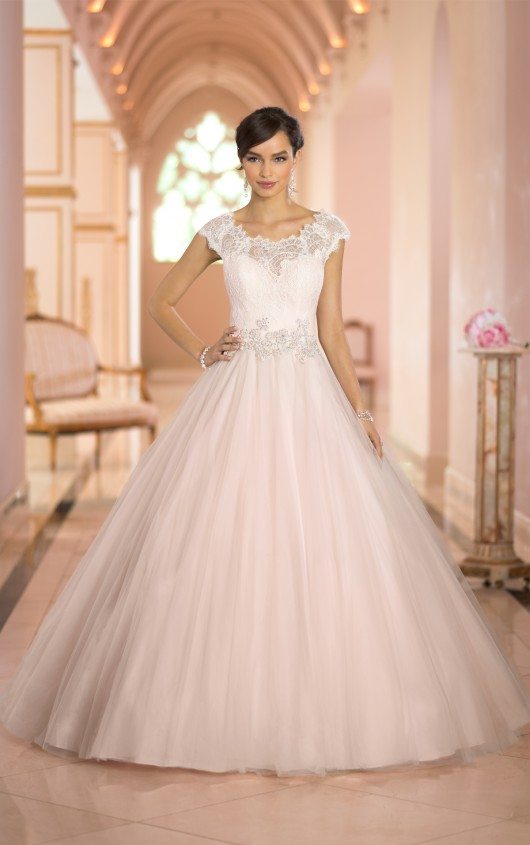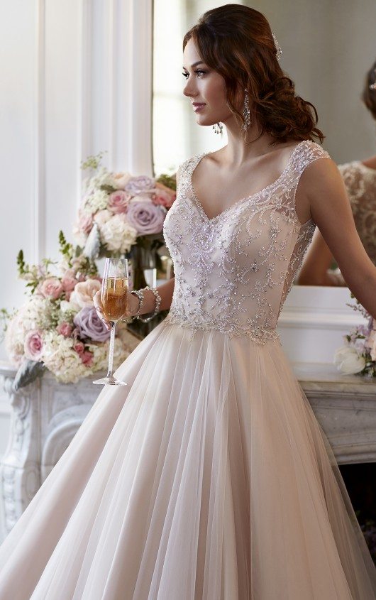 We love this princess-esque, classy design, including the peach-hued skirt and beaded waistline.