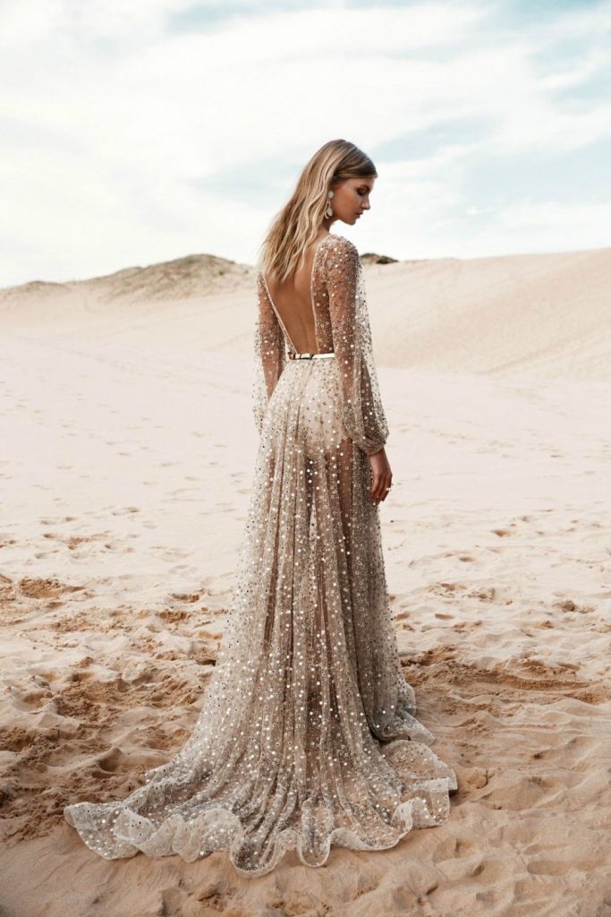 Sparkle a bit in this gown, pay close attention to its train and know that you will look gorgeous once your slip into it.