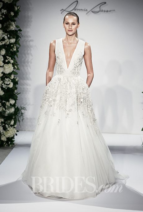 A dipping neckline gives a subtle sexiness that’s undeniable in this beautiful, sparkling ball gown.