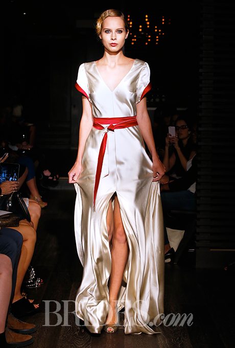 A dress inspired by the snowfall with its feathered accents, this gown also gives a bit of a “side” show in a most sophisticated way.