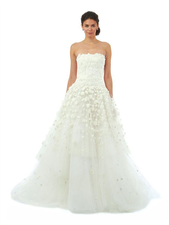 The delicate, flower motifs on this dress are absolutely charming, perfect for a garden wedding.
