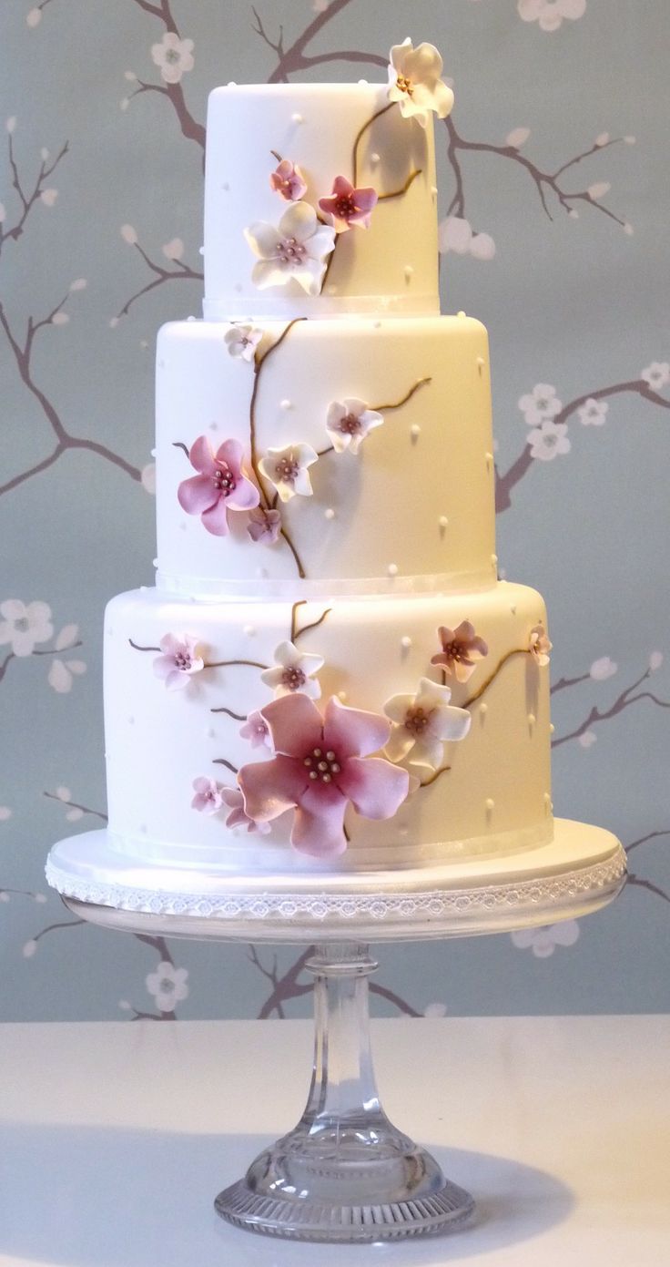 A cake made with white satin frosting and smooth blackberry filling, this cake also includes white fondant dogwood blossoms. An elegant option for a springtime reception, this cake is best made with pre-purchased white-rolled fondant. It’ll save you a lot of time!