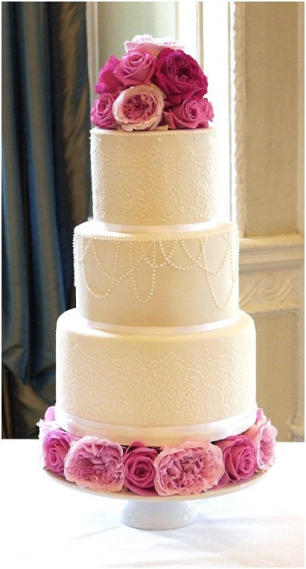 And other times you may want to keep it chic and simple and line each smooth tier with some soft and romantic (and edible) pearls.