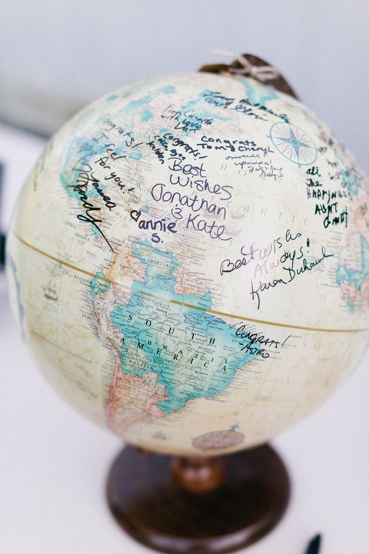 ON TOP OF THE WORLD: We are seriously gushing over this global guest book. Have guests simply sign wherever, or have them sign in their favorite spot they’ve traveled, OR where they wish you will travel together as a couple. Then you are obligated to see them all, right?