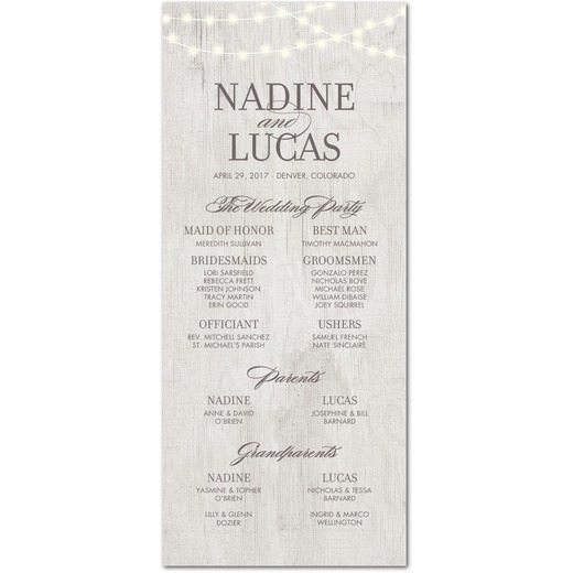 Wedding programs are a great way to keep your guests feeling included and engaged in the celebration. Create one just for the ceremony, a separate one for the reception or design one that will outline the entire night’s festivities. It’s important that you include some of the most essential details though.