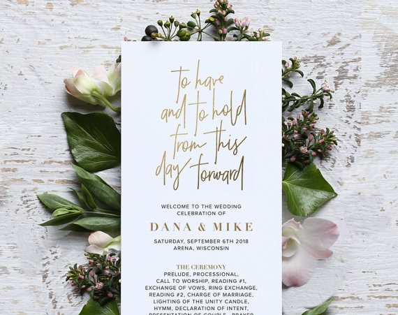 Once you’ve settled on a design then you start the customization process. Depending on the website you buy your invitations/programs from, you will typically have several color schemes and font styles to choose from for each design. You can play around with the options and see the changes in real time (warning, some solutions are better than others but we’ve found most to be pretty good here). If you choose a custom wedding program template that needs a photo this is probably when you will be prompted to upload it. Make sure to use a high-quality image as sometimes it won’t look good when printed. At this stage you are entering all the wedding details (probably a good idea to have that stuff handy when you start this process). You then pay and your beautiful, custom wedding programs will ship to you in no time.