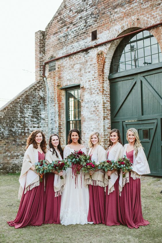 When deciding on the bridal party’s ensemble, you’ll definitely want to take the time of year into consideration. Since your celebration is going to be holiday-inspired, bring that same spirit into the wedding attire.