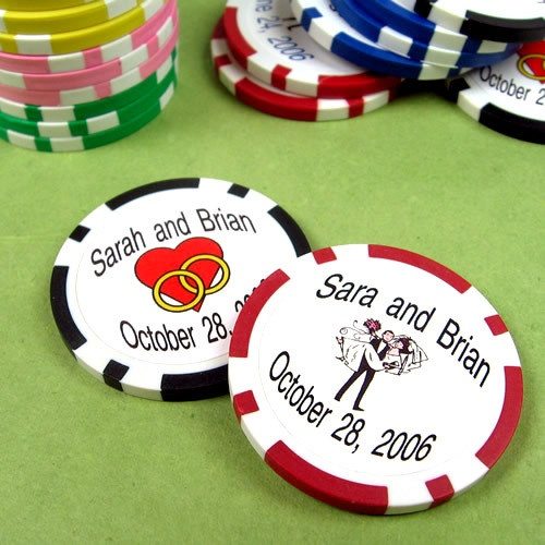 For a Vegas wedding you could have some fun with poker chip mint tins or custom printed wedding poker chips with the bride and groom’s names printed on them.