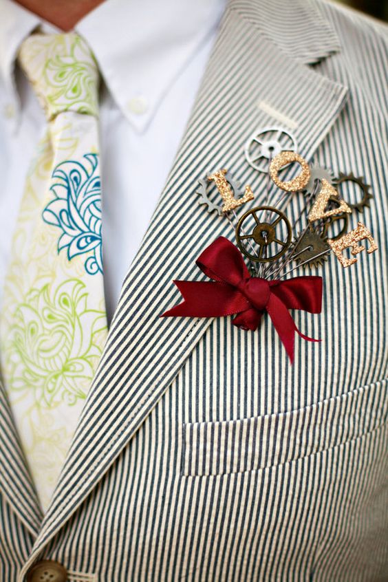 Not every boutonniere or bouquet has to be filled to the gill with petals and lace. Instead, you can get really creative with their design, add some personal style and embellishments that fit the theme of the day. Check out these 10 unique boutonnieres that will add a special pop to the groom and inspire your own big celebration!