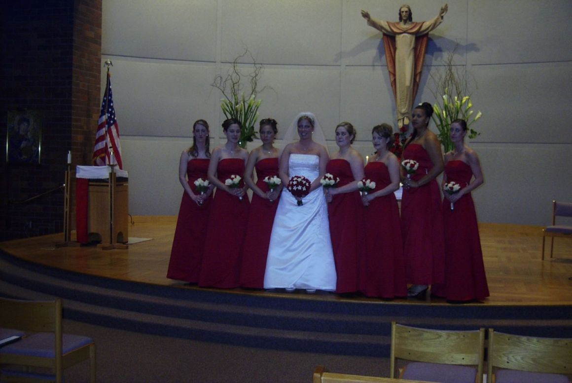 I don’t often worry too much about the reception site décor, but sometimes you have to because the décor colors are so in your face. You will have to decide for yourself whether you need to keep the reception site color scheme in mind when determining what color flowers to use for your wedding. I think it is more important to match the dresses and flowers and continue with whatever color scheme you have chosen for the guest tables and church décor.