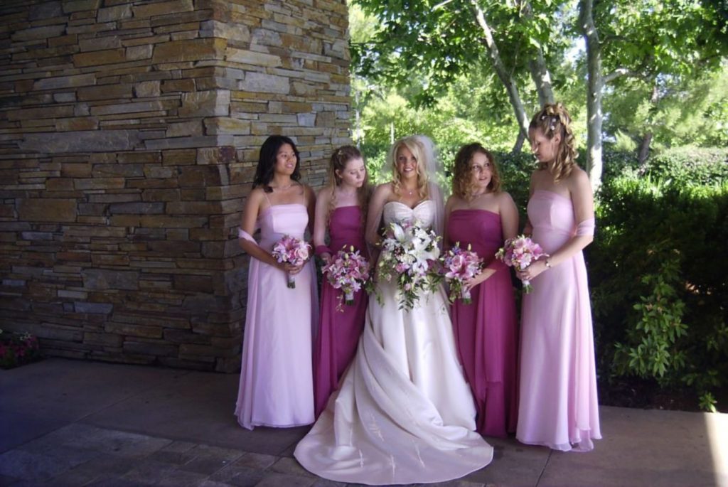 In this next example, notice that the girls are wearing different shades of pink gowns. They carried the same flowers, which were made up of various shades of pink flowers, but notice how the flowers show up so much better against the darker pink gowns? They still show up with the pale pink gowns, because I included some darker pink flowers in the bouquets; but the point is can you see what I am talking about?