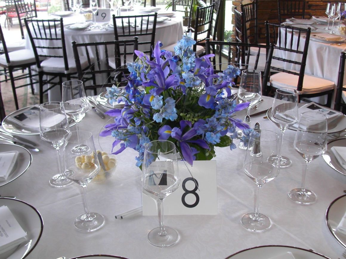 I have a wedding coming up where the girls are wearing the dark eggplant colored dresses. My bride and her mom saw a picture in my photo album of a centerpiece that they both really loved. It happens to be shades of blues and purples. In fact, as a side note, these centerpieces were used for a fundraiser here in El Dorado Hills in 2006 where President Bush was the guest of honor. Below is a photo of the centerpiece. So this is an example of missing different colors together. This same bride has chosen to use white flowers with purple accents for her bouquets. Again, because white will be the primary color of the bouquets, they will stand out against the purple dresses.