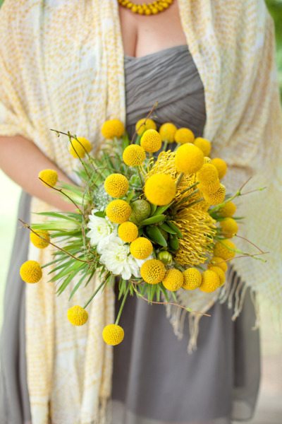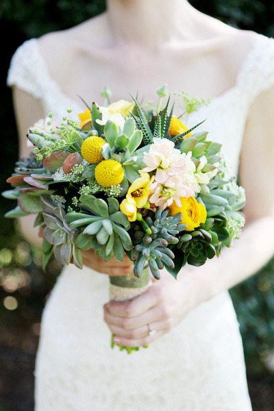 Brighten up the bride or the bridesmaids with a sunshine-inspired bouquet full of yellow florals or accents. Let’s have a look at some beautiful, yellow bride bouquets full of vivaciousness and life.