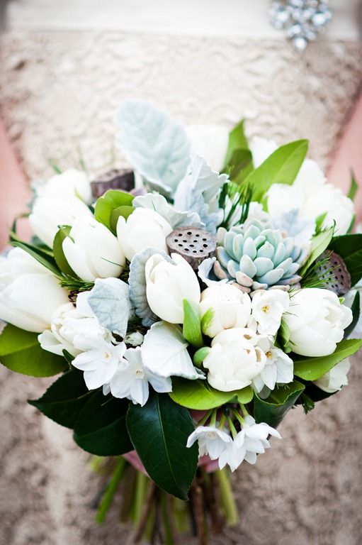 We love the softness of a ivory tulip sewn into a design with lots of different textures.