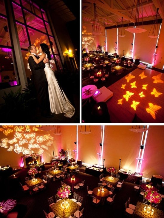 For a fraction of the cost of extra flowers or more decorations you can make a spectacular statement, add elegance and excitement, and create an atmosphere that is truly memorable just by using lights. Lighting can be used to highlight your flowers and other decorations, as well as add color and drama to an entire room. Below are details on the various lighting treatments you might consider for your upcoming wedding.