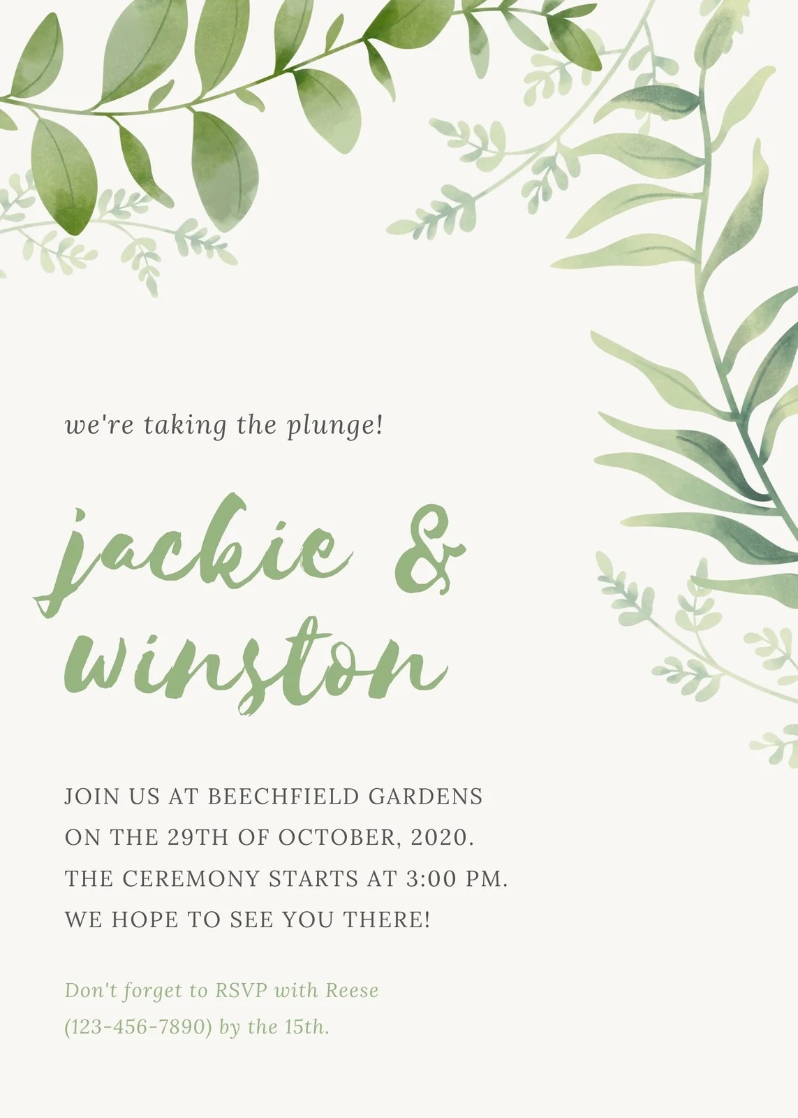 Simple, on-trend, and a minimalistic bride’s dream, this green and slightly rustic template is a beautiful choice for your spring wedding. Of course, the words and colors are customizable but just the sample is giving us timeless vibes and quality.
