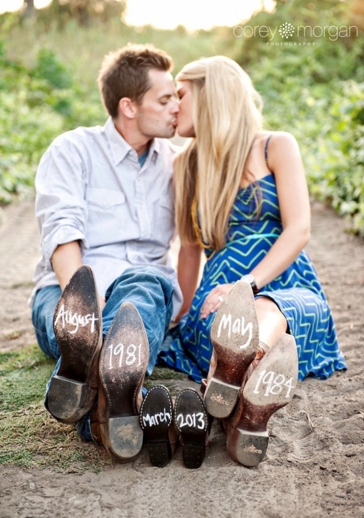 Get goofy and take one of the classic “Awkward Family Photos” that are so popular right now. Dress up in cheesy matching outfits or pose like it’s a 1970s prom photo. You’re sure to get a large following. This can be sent in the mail as save the dates, emailed and it can be blasted on the web. If cheesy outfits are too unique wedding announcement for you, then you can tame it a little and do something cute like this couple below when announcing your wedding.