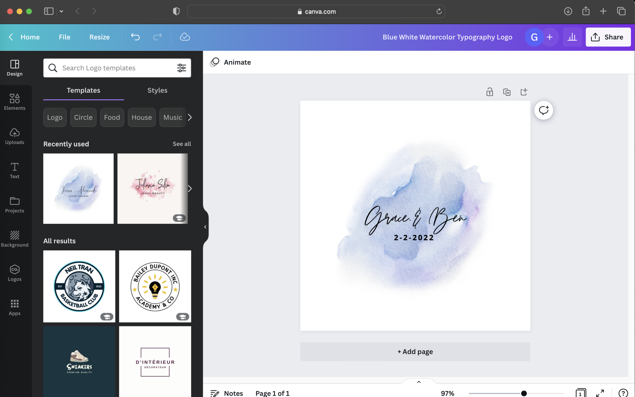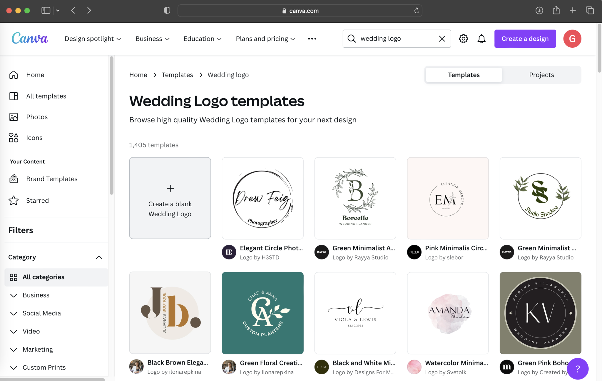 Once logged in, start your search for the right template or inspiration to begin designing. You can even key in “Wedding Logo,” and become instantly inundated with over 1,000 options. From modern to farmhouse-chic to artistic to bohemian, there are tons of places to start your creation of making that unique symbol representing your new life as one.