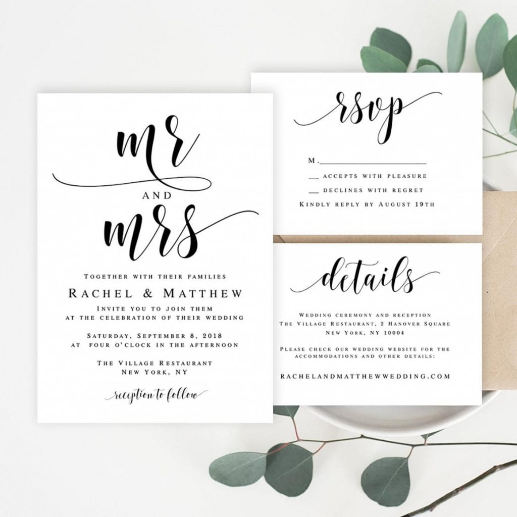 This chic and clean invitation is a downloadable (and SO affordable) template that you can customize and then print to your whim. There are multiple matching pieces to complete your suite as well – all for prices that will fit all kinds of workable budgets.
