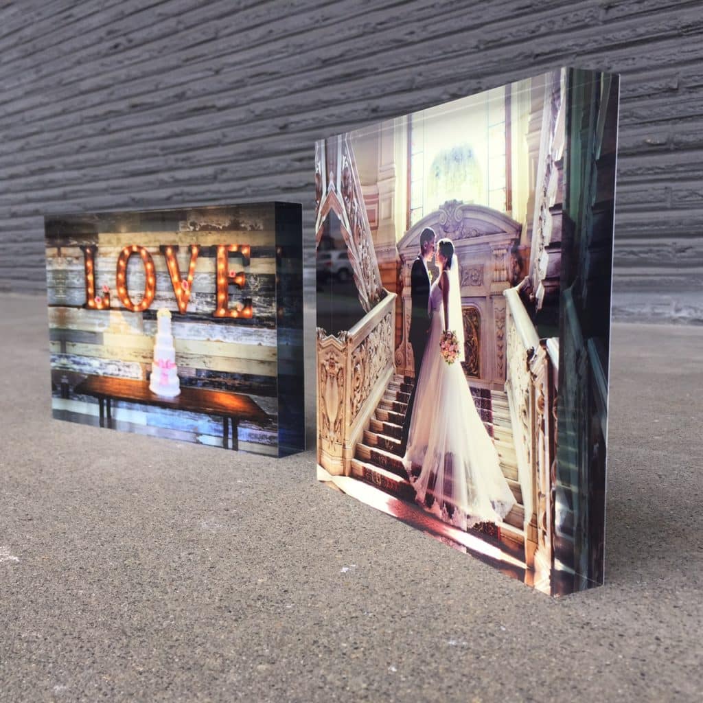 One of the most stylish and modern display methods for wedding photographs is the photo block. These frameless displays allow your photographs to stand on their own and give the impression of a 3D image.