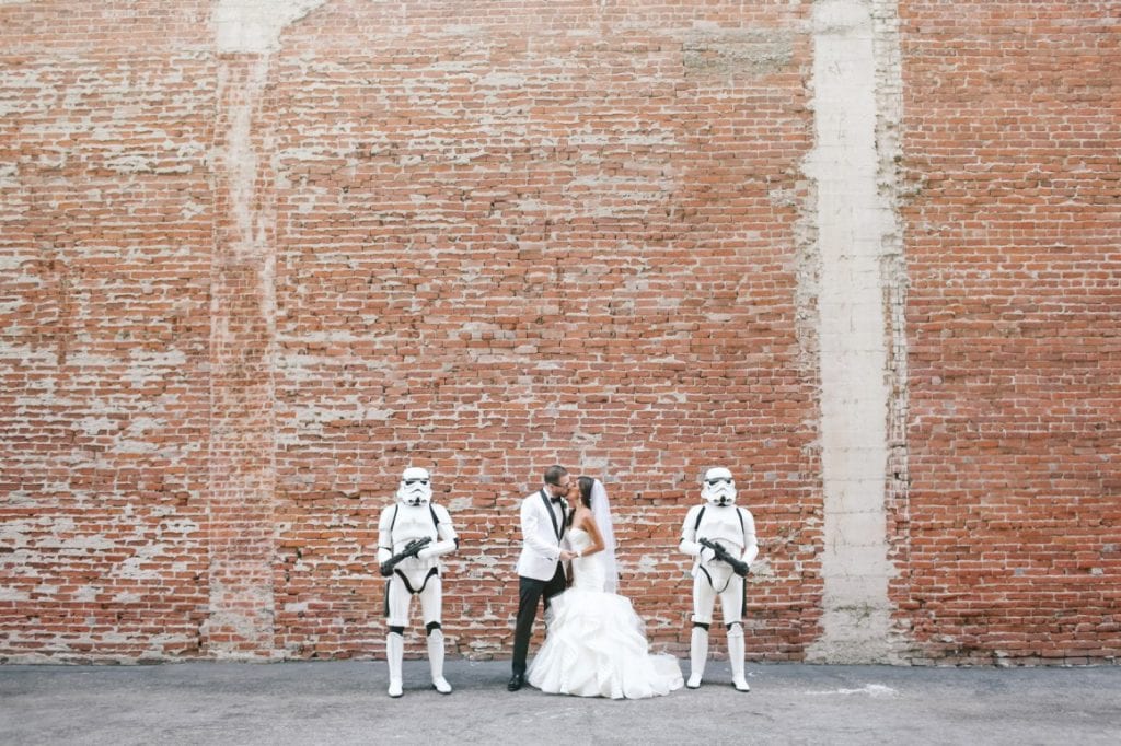 Don’t shy away from using large, open areas and utilizing the interesting texture of those spaces. Just take a look at this piece! The brick adds so much artistic presence and life to the photo – and the couple was able to include a bit of their own personality and pizazz as well. Besides, the groom (and their stormtroopers) really POP!