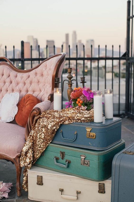 Think about seating that adds to the style and theme of the day, vintage suitcases and colorful chairs are such a few great examples.