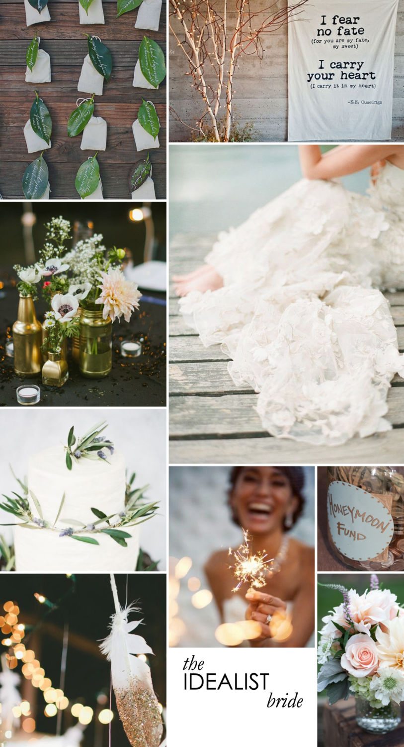 The idealist loves harmony, beauty, and whimsy. Is this you? Your wedding will most likely be full of light—string lights, sparklers, glitter, and gold. It’s your day; make it as beautiful as you like. Glass, fresh fruit, greenery, pieces collected during your travels? You love so many things, you might find it difficult to narrow down your choices—so don’t! Who says you can’t have twenty varieties of flowers? Or simply wildflowers? Heavy, glamorous makeup not really your thing? Go for a dewy look instead to reflect your spirited outlook on life, choosing creams and lip stains instead of powders. Wear colorful, statement jewelry, let your hair down, and nix the shoes. Remember, don’t worry about what you think you should do. It’s your day, your dream.