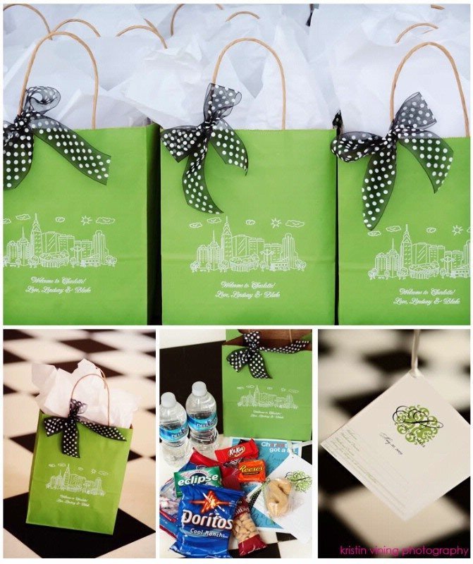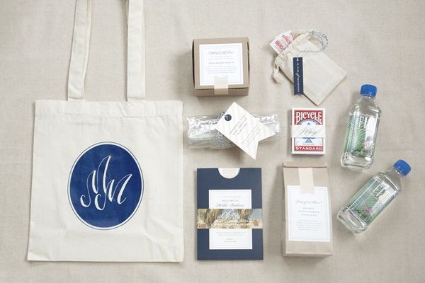 An out-of-town gift bag can be as elaborate or as simple as you want. Start with deciding what type of container you want to use for your “bag.” Will it be a reed basket lovingly made by local artisans? Or a linen tote bag embroidered with your names and wedding colors?