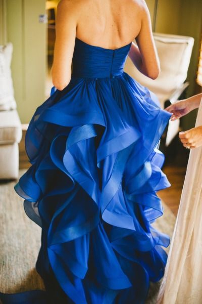 A wedding gown that plays off the royal blue shade could be a gorgeous compliment and unique pop for the bride-to-be.