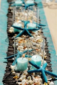 To recreate that paradise, potted palm trees and large ferns are a must. You can rent them for the day, and no other prop will better say “beach.” Potted palms are also a great way to fill a large space for reasonable cost. If your reception’s in the evening, tuck uplighting at the base for the “wow” factor, and wind string lights around the trunks.