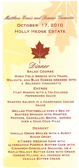 We then took a short walk on a cobblestone path down to the reception hall, where our florist was able to take a fairly blank canvas and decorate for our Autumn theme. There is still a rustic element to the hall, but the building is far more modern, which you would probably want for eating and dancing anyway. Speaking of eating, we’re all “foodies”, so the menu was important and they didn’t let us down there. The food was fantastic and imaginative. The chef on premises worked with us in advance to design a sit-down menu that we were able to tweak to our specifications. We sat down to rave reviews that day!