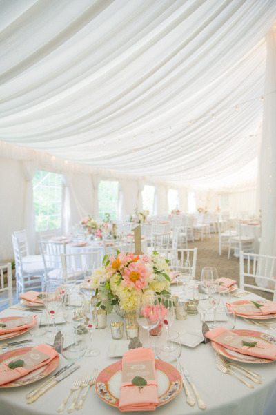 Place a color sticker underneath each of our floral table centerpieces. As the dinner portion of the reception began, the emcee calls out a color. Whichever table had the color sticker that matched the color the emcee announced, the guests sitting at the table were allowed to line up at the buffet table.