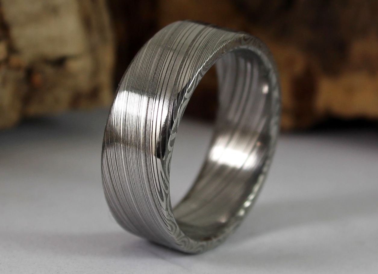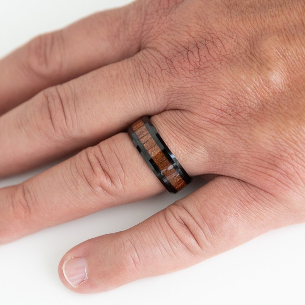 Wood inlays add a level of contrast and elegance, combining two materials to create a unique look. Examples of wood used include koa, maple, birch, hickory, and walnut, all of which hold up well as these rings can be inlayed with different metals like tungsten carbide and titanium.