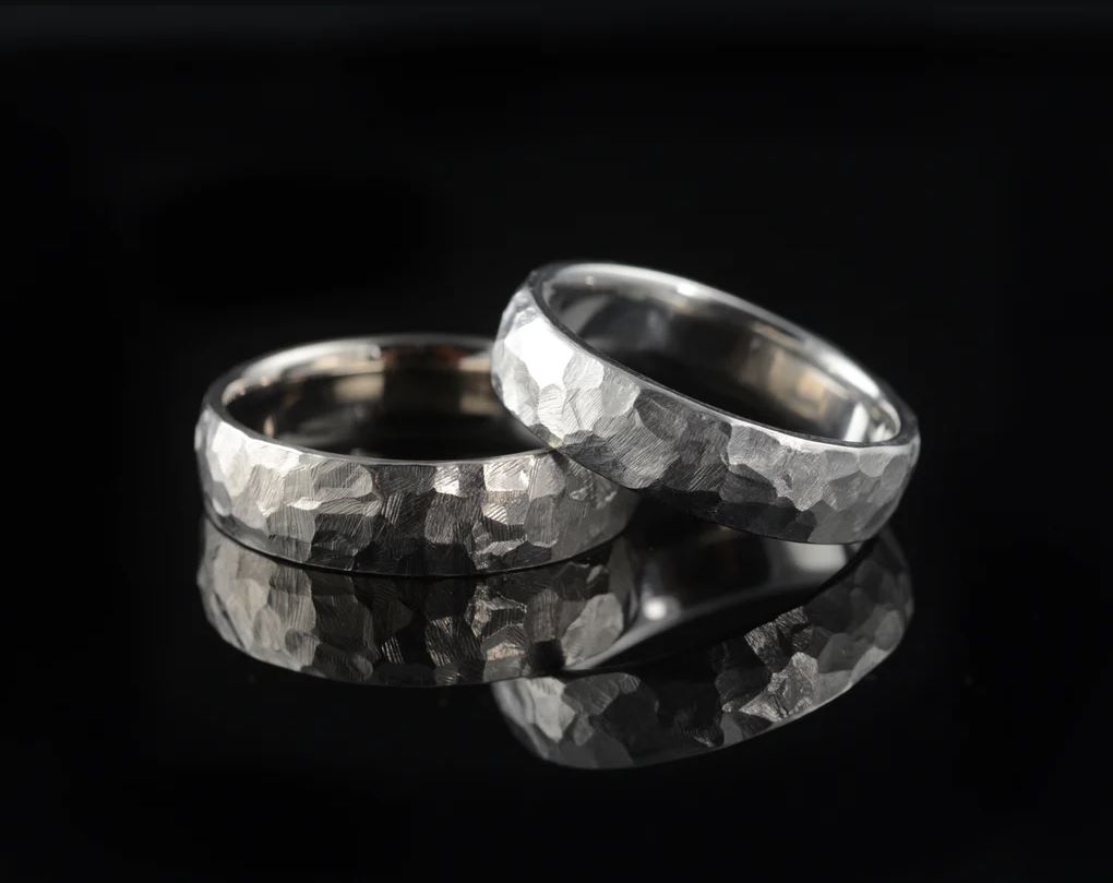 Textured wedding bands provide an understated appearance that is perfect for those who want something lowkey yet unique and interesting to look at. A brushed matte finish is common for this design type as the light is diffused on the hammered surface yet reflects off of the edge of the ring.